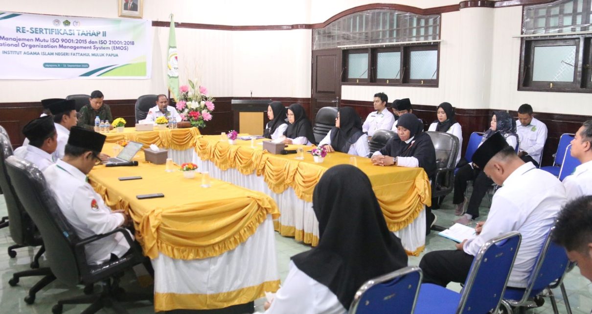 (iainfmpapua.ac.id) – Institut Agama Islam Negeri (IAIN) Fattahul Muluk Papua menggelar kegiatan Re-Sertifikasi Tahap II Sistem Manajemen Mutu ISO (International Organization for Standardization) 9001:2015 dan ISO 21001:2018 Educational Organization Management System (EMOS) di aula kampus, 8 September 2025. Dalam sambutan pembukaan kegiatan ini, Rektor IAIN Fattahul Muluk Papua Dr. H. Marwan Sileuw, S.Ag, M.Pd mengatakan