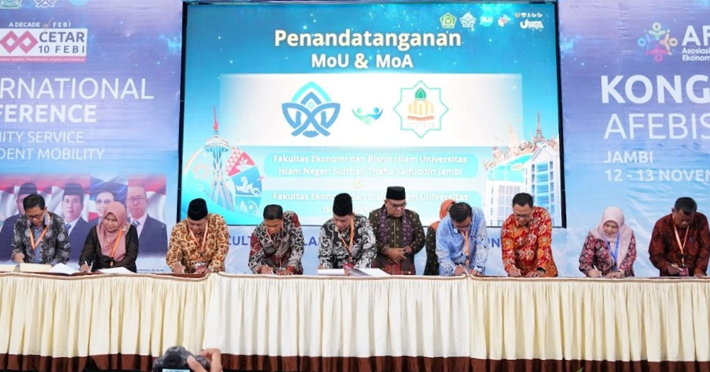 (iainfmpapua.ac.id) – Fakultas Ekonomi dan Bisnis Islam Institut Agama Islam Negeri (IAIN) Fattahul Muluk Papua melaksanakan penandatanganan perjanjian kerjasama memorandum of agreement (MoA) bersama Fakultas Ekonomi dan Bisnis Islam UIN Sultan Thaha Jambi dalam moment kegiatan Kongres Asosiasi Fakultas Ekonomi dan Bisnis Islam (AFEBIS) 2025 yang merupakan rangkaian The First FEBI’s International Visit Academic and Conference on Islamic Economics and Business (ICOIEB) di Jambi, 12 November 2025.