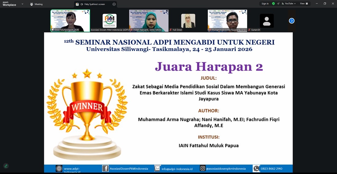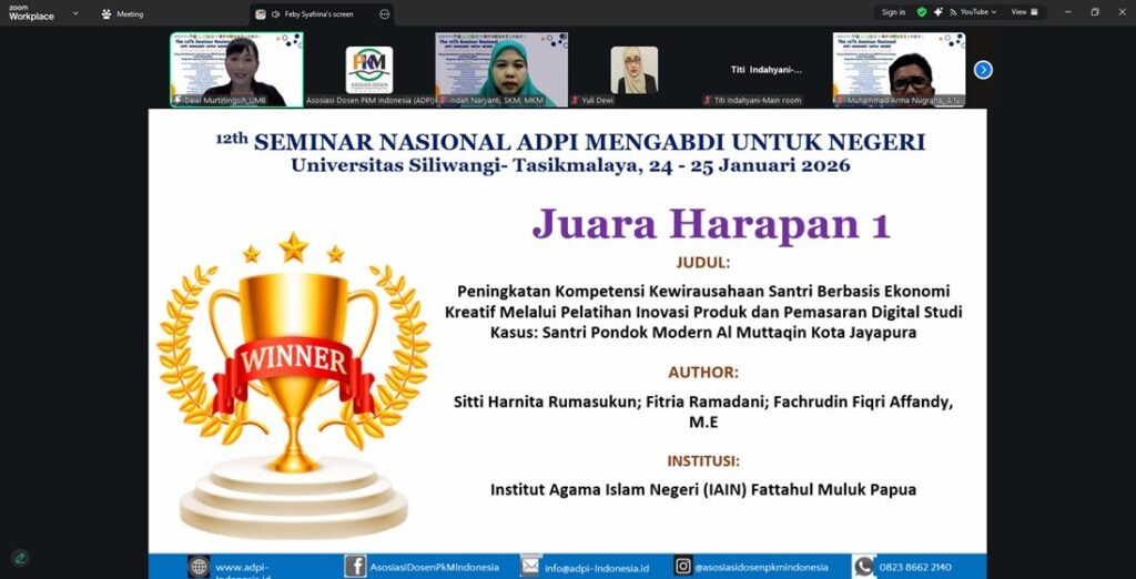 (iainfmpapua.ac.id) – Mahasiswi Program Studi (Prodi) Perbankan Syariah Fakultas Ekonomi dan Bisnis Islam Institut Agama Islam Negeri (IAIN) Fattahul Muluk Papua Sitti Harnita Rumasukun dan Muhammad Arma Nugraha meraih juara harapan 1 dan 2 serta Best Presenter pada The 12th Seminar Nasional ADPI Mengabdi Untuk Negeri dengan tema ‘Sinergi Multidisipliner dalam Hilirisasi IPTEKS Berbasis Ekologi untuk Mewujudkan Penguatan Kapasitas dan Kemandirian Masyarakat’ yang diselenggarakan Asosiasi Dosen Pengabdian Indonesia (ADPI) berkolaborasi dengan Universitas Siliwangi, secara virtual 24-25 Januari 2026.