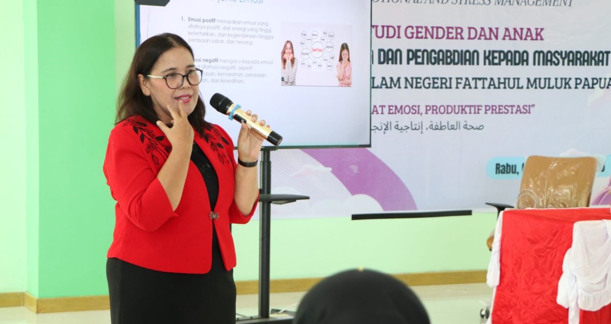 (iainfmpapua.ac.id) – Pengelolaan emosi sangat penting untuk kesehatan mental. Psikolog RSUD Abepura Jayapura, Nursia Sirait, M.Psi Psikolog memaparkan hal ini dalam Pelatihan Pengelolaan Emosi dan Stres yang diselenggarakan Pusat Studi Gender dan Anak (PSGA) Lembaga Penelitian dan Pengabdian Kepada Masyarakat (LPPM) Institut Agama Islam Negeri (IAIN) Fattahul Muluk Papua, di Aula Kampus, 3 September 2025.