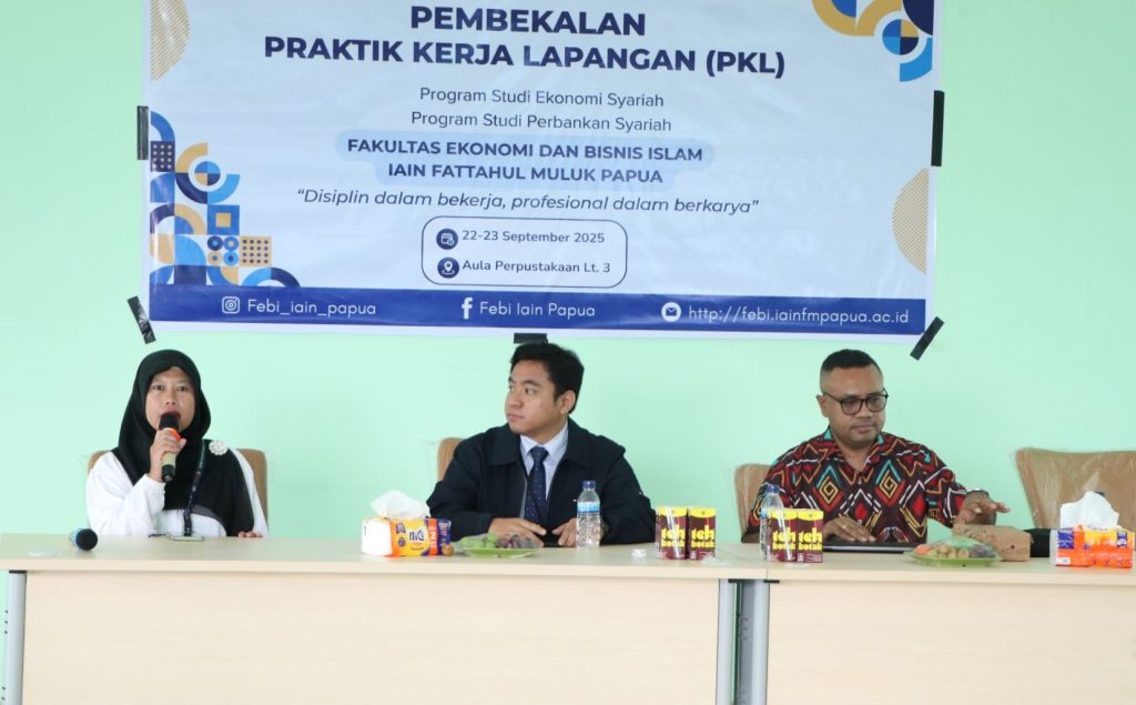 (iainfmpapua.ac.id) – PKL adalah moment di mana mahasiswa dapat menunjukkan performa terbaiknya di lapangan. Wakil Rektor I Institut Agama Islam Negeri (IAIN) Fattahul Muluk Papua, Dr. H. Talabudin Umkabu, M.Pd menyampaikan hal ini pada sambutan Pembekalan Praktik Kerja Lapangan (PKL) Fakultas Ekonomi dan Bisnis Islam (FEBI) IAIN Fattahul Muluk Papua, di Aula Kampus, 22 September 2025.