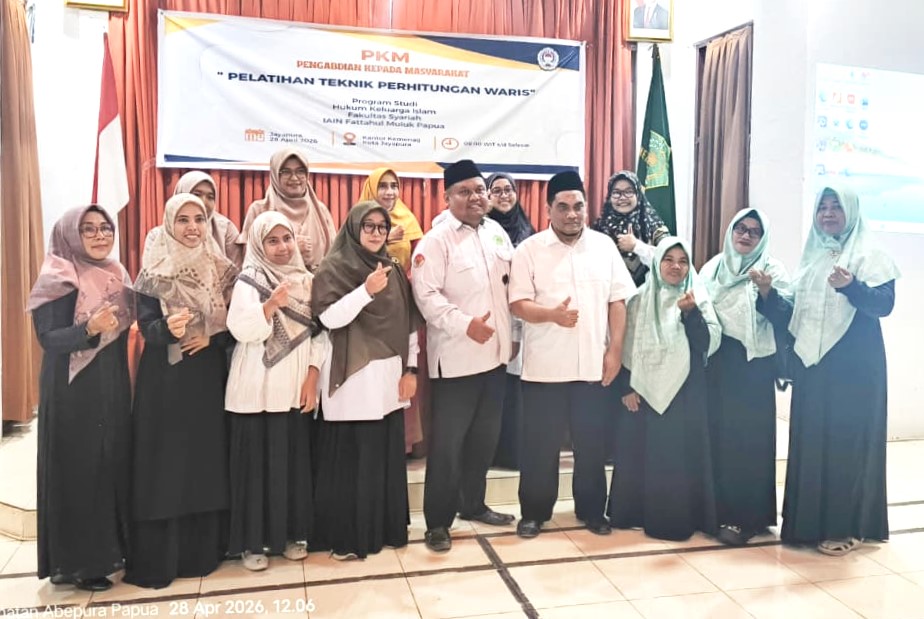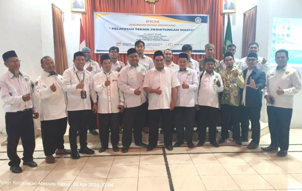 (iainfmpapua.ac.id) – Program Studi Hukum Keluarga Islam (HKI) Fakultas Syariah Insitut Agama Islam Negeri (IAIN) Fattahul Muluk Papua menggelar Pengabdian Kepada Masyarakat (PKM) dengan tema ‘Pelatihan Teknik Perhitungan Waris Bagi Tokoh Agama Islam di Kota Jayapura’, di Aula Kementerian Agama Kota Jayapura, 28 April 2026.